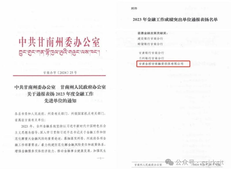 近日,甘南州委召开金融工作会议,对2023年度金融工作成绩突出的人民银行甘南州分行、国家金融监督管理总局甘南监管分局、建设银行甘南分行、邮储银行甘南分行、甘肃银行甘南分行、兰州银行甘南分行、甘肃金控甘南融资担保有限公司等单位予以通报表扬。授予金控甘南担保公司“普惠金融发展贡献奖”。