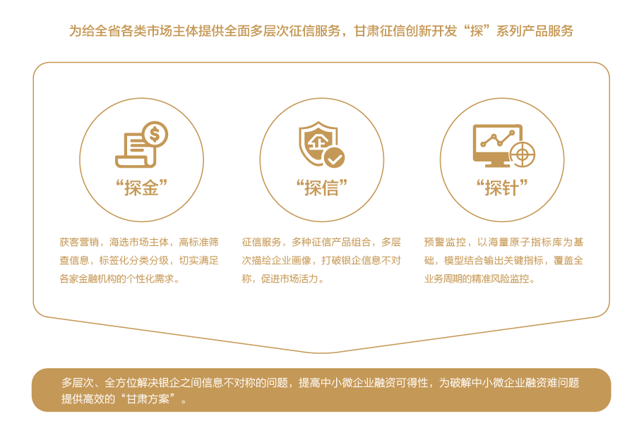 甘肃征信建立以征信数据库、数据处理系统、征信智能应用系统为核心的企业征信服务平台,为客户提供征信报告、信息核验、信用评分、智能风控分析决策等综合信用服务,实现在线经济金融、社会管理、公共服务等多领域的广泛应用。